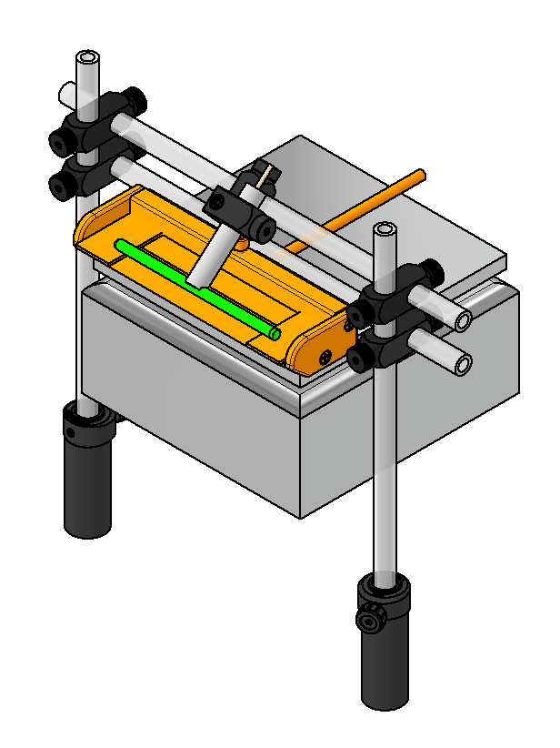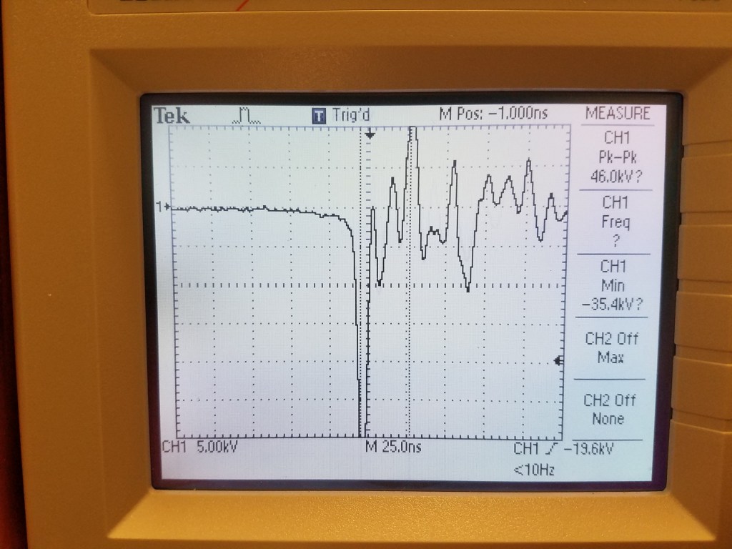 I designed an electrode assembly to pair with a electrospinning source plate/ground electrode (figure b highlighted in orange) to form a plasma reactor. The assembly was constructed from glass tubing and could be adjusted in the x, y, and z directions to change the high voltage electrode (figure b highlighted in green) gap and position relative to the ground electrode. The high voltage electrode was isolated from the assembly using a PEEK jacket and was fabricated using a borosilicate glass dielectric potted with an aluminum electrode using conductive silver epoxy. The reactor was driven using a nanosecond pulse generator, whose waveform under this load can be seen in figure c.
